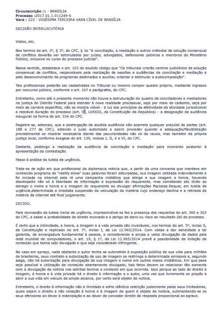 Tribunal/Vara: 23ª Vara Cível - Brasília - DF "Trata-se de ação em que profissional da diplomacia noticia que, a partir da uma conversa que manteve em conhecido programa de "reality show" suas palavras foram deturpadas, sua imagem utilizada indevidamente e foi iniciada na internet pela ré uma campanha midiática que atinge a sua imagem e honra, havendo desrespeito não só à liberdade de informação e e... Comentado por: - Omar Kaminski - [ Gestor do OMCI ] -