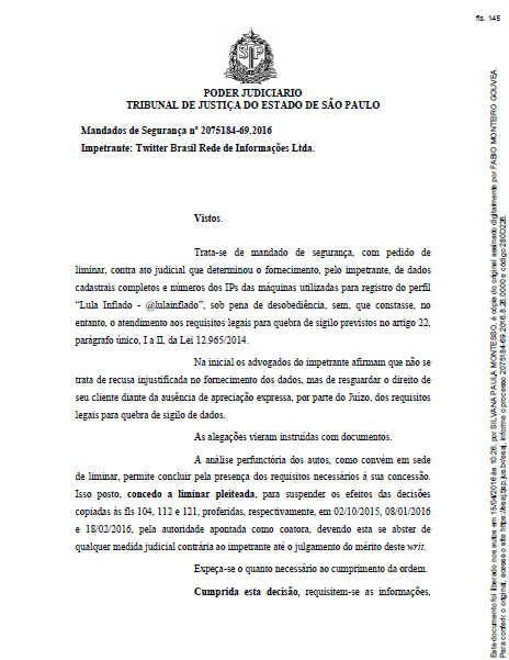 Tribunal/Vara: Tribunal de Justiça de São Paulo - TJSP "Trata-se de mandado de segurança, com pedido de liminar, contra ato judicial que determinou o fornecimento, pelo impetrante, de dados cadastrais completos e números dos IPs das máquinas utilizadas para registro do perfil “Lula Inflado - @lulainflado”, sob pena de desobediência, sem, que constasse, no entanto, o atendimento aos requisitos legais para que... Comentado por: - Omar Kaminski - [ Gestor do OMCI ] -